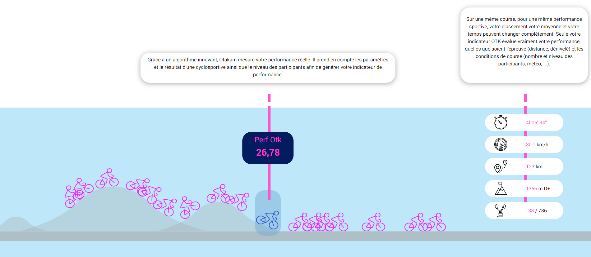 “Jusqu’à aujourd’hui, il n’existait pas d’indicateur de performance cyclosport. En effet, tous les parcours sont différents, les conditions météorologiques sont très variables d’une course à l’autre, tout comme le niveau des participants, ce qui empêche de comparer entre eux les résultats. Parfaitement représentatif de la performance réalisée, l’indicateur Otakam croise les résultats des épreuves disponibles et tient compte de la difficulté du parcours. Grâce à Otakam, nous pouvons désormais mesurer nos propres performances et les comparer à celles de nos coéquipiers de club, d’un ami à l’autre bout de la France ou du champion régional."